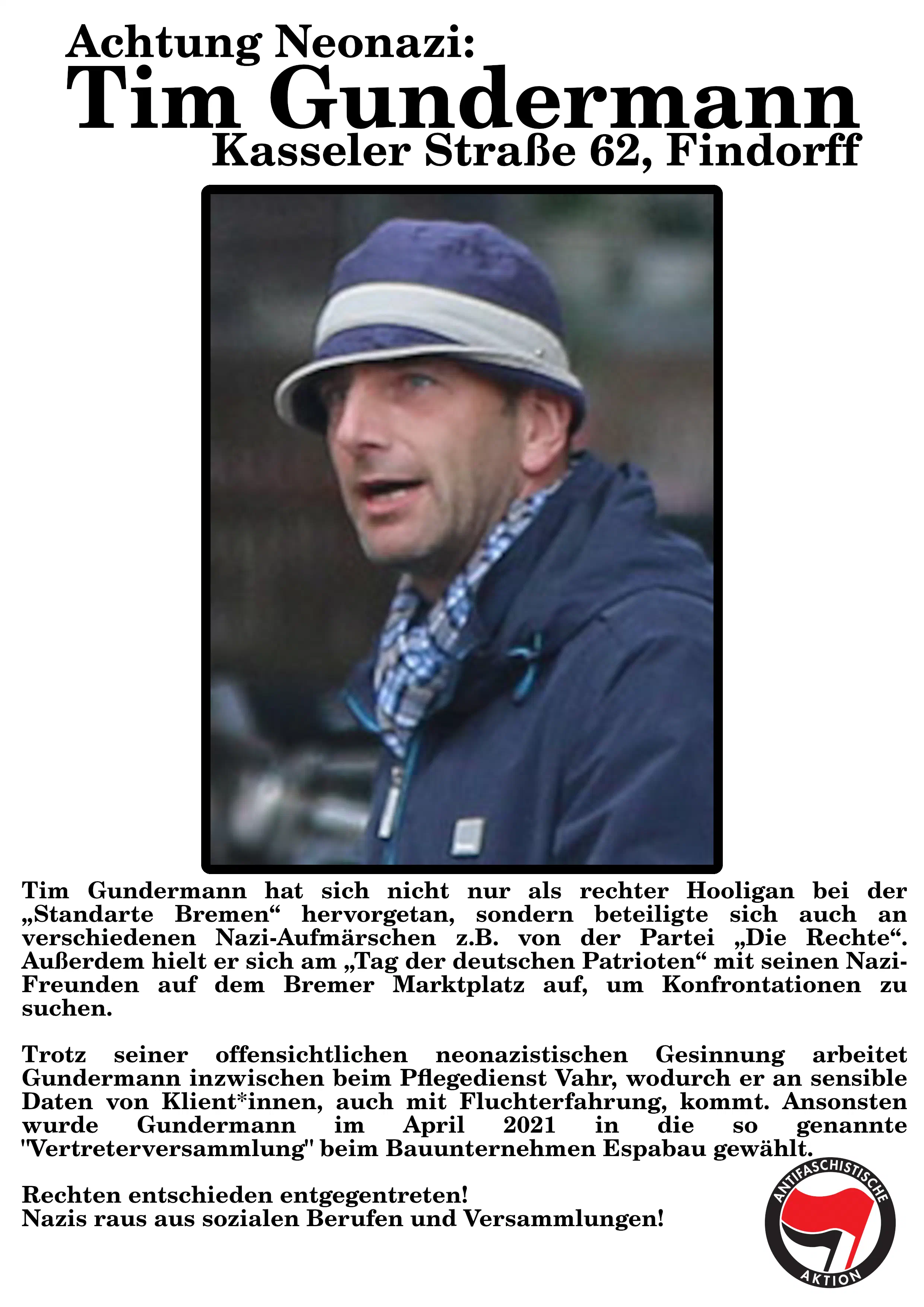 Wir haben den Bremer Neonazi Tim Gundermann bei seinen Nachbar*innen, seinem Arbeitgeber sowie seiner Vermieterin geoutet.