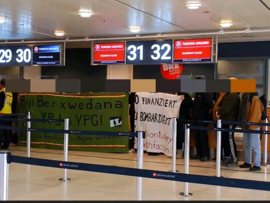 Wir blockierten den Check-In des türkischen Staatsunternehmens Turkish Airlines in Bremen, um auf den völkerrechtswidrigen Angriffskrieg auf Gebiete der kurdischen Selbstverwaltung aufmerksam zu machen.