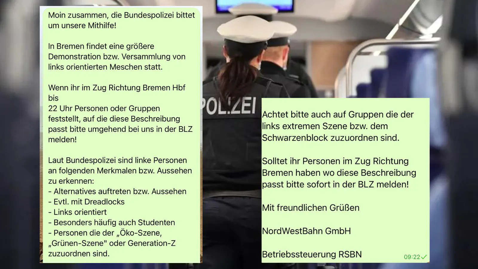 NordWestbahn du scheiß Hilfsbulle! Zu wütenden Protesten gegen das Urteil gegen die Antifaschistin #freeLina und für einen militanten #Antifaschismus sind gestern in #Bremen bis zu 400 Menschen auf die Straße gegangen. Dabei kam es teils zu schweren Auseinandersetzungen mit der #Polizei. Diese besetzte bis tief in die Nacht mit einem Großaufgebot, Wasserwerfer und Räumpanzer das Steintor und Ostertorviertel. Im Zug eines „Kessels“ wurden dabei ca. 70 Personen von der Polizei in die Polizeizentrale in der Vahr verbracht, weitere einzelne Ingewahrsamnahmen kamen dazu. Im Gegensatz zu der von Butenunbinnen zitierten Presseerklärung der Polizei, wurden dabei durch die Polizei Demonstrant*innen Teils schweren Verletzungen zugefügt. Die Versuche der Polizei rechtswidrig im direkten Anschluss Ärzt*innen der Bremer Krankenhäuser nach etwaigen verletzten Genoss*innen zu befragen zeigt, auch die Polizei weiß selbstverständlich davon. Dabei hat die Polizei ihre Versuche, Antifaschist*innen habhaft zu werden, wie nun bekannt wurde, noch wesentlich weiter ausgedehnt Antifaschistische Kolleg*innen haben uns folgende screenshots aus den internen chats der NordWestbahn zukommen lassen. Wir haben das Aussehen der chats zum Schutz der Kolleg*innen verändert. In diesen ruft sie zur Fahndung gegenüber Fahrgästen auf Grund äußerlicher Merkmale auf: Personen die „grün“ sind oder „alternatives auftreten“ an den Tag legen, „Studenten“ oder Angehörige der „Generation Z“, d.h. im Alter Anfang Zwanzig sind, seien unverzüglich zu melden. Übernommen habe die NordWestbahn diese eindeutigen „Merkmale“ von der Bundespolizei. Die Ausweitung der Fahndungstätigkeiten der Polizei auf ein privates S-Bahn-Unternehmen und auf große Teile der Bremer Bevölkerung stellt ein neues, bisher unbekanntes Maß an staatlicher Repression gegen über Antifaschist*innen in Bremen da. Die vielen Rückmeldungen aber, sowohl von sehr vielen Bremer*innen gestern als auch der, zu Recht empörten, Kolleg*innen der NordWestbahn zeigt aber auch: Weit kommen sie damit nicht.