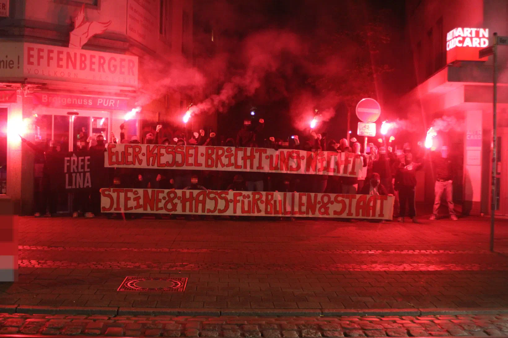 In Bremen mobilisierten sich ca. 400 Antifas im Viertel. Unangemeldet wollten wir uns die Straße nehmen. Einige Zeit klappte dies auch, die Bullen kriegten fliegende Gegenstände ab, Pyros brannten und eine Wanne verlor nen Außenspiegel. Trotzdem endete der Abend nach ein paar Minuten für ungefähr 70 Antifas in einem großen Kessel in der Ritterstraße. Unter fragwürdigen Bedingungen, ohne Zugang zur Toilette, ohne Essen, ohne Trinken ging es dann ab auf die Wache. Die Bullen haben mal wieder aufgefahren was geht und waren samt Wasserwerfer und Räumungspanzer mit ein paar Hundert Leuten im Einsatz.