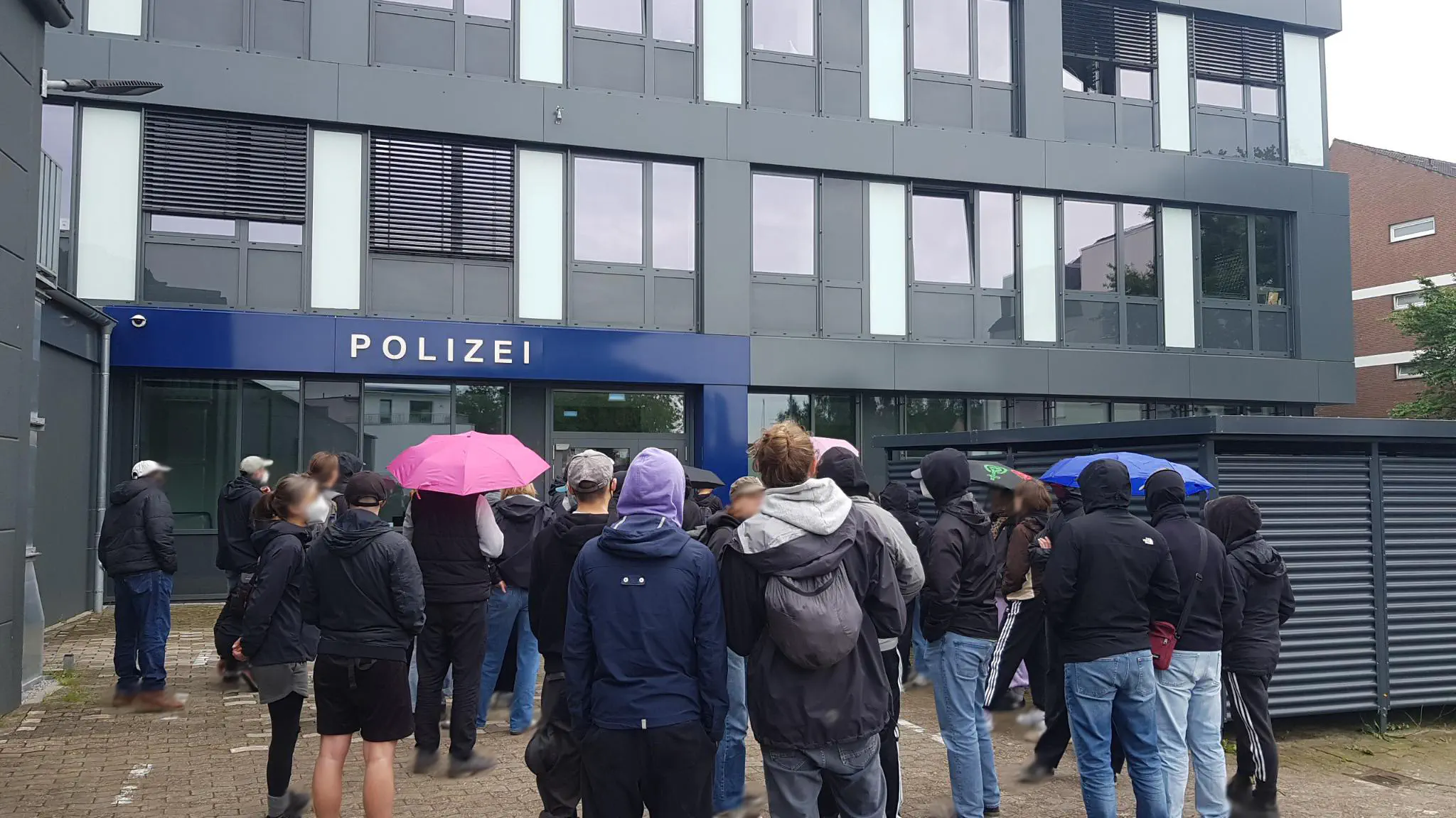Die unangekündigte solidarische Begleitung verfehlte nicht ihre Wirkung. Mit Musik und Regenschirmen zogen wir auf den Parkplatz der Kripo in der Feuerkuhle 32. Einzelne Beamt*innen schauten aus den Fenstern, aber ließen die Tür lieber verschlossen, obwohl wir immer wieder lautstark auf unseren Termin hinwiesen. Erst nach Eintreffen einiger Uniformierter in Streifenwagen nahm der „Leiter des Standortes“ die Kommunikation auf. Der Forderung nach Einlass der gesamten Gruppe wurde nicht nachgekommen, als Kompromiss durfte eine Person den Genossen zur Maßnahme im Gebäude begleiten. Auf dem Parkplatz wurde noch, zur Sicherung der Privatfahrzeuge der Bullen, ein grimmig drein blickender Kripo-Beamter abgestellt. Die Uniformierten zogen wieder ab. Wir warteten auf unseren Genossen und verließen nach kurzer Zeit mit ihm gemeinsam das Gelände der Kripo.