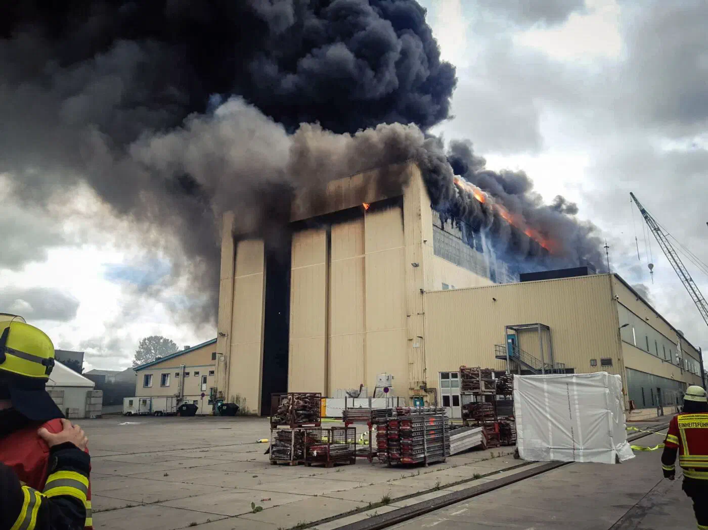 Ein Polizeisprecher sprach von Temperaturen von mehr als 1.000 Grad. Die Feuerwehr versuchte die Hallenwände von außen zu kühlen, um die Temperatur im Halleninneren zu senken. Der Versuch, das Feuer auch von innen zu löschen, musste laut einem Feuerwehrsprecher abgebrochen werden, weil Teile der Halle einzustürzen drohten.