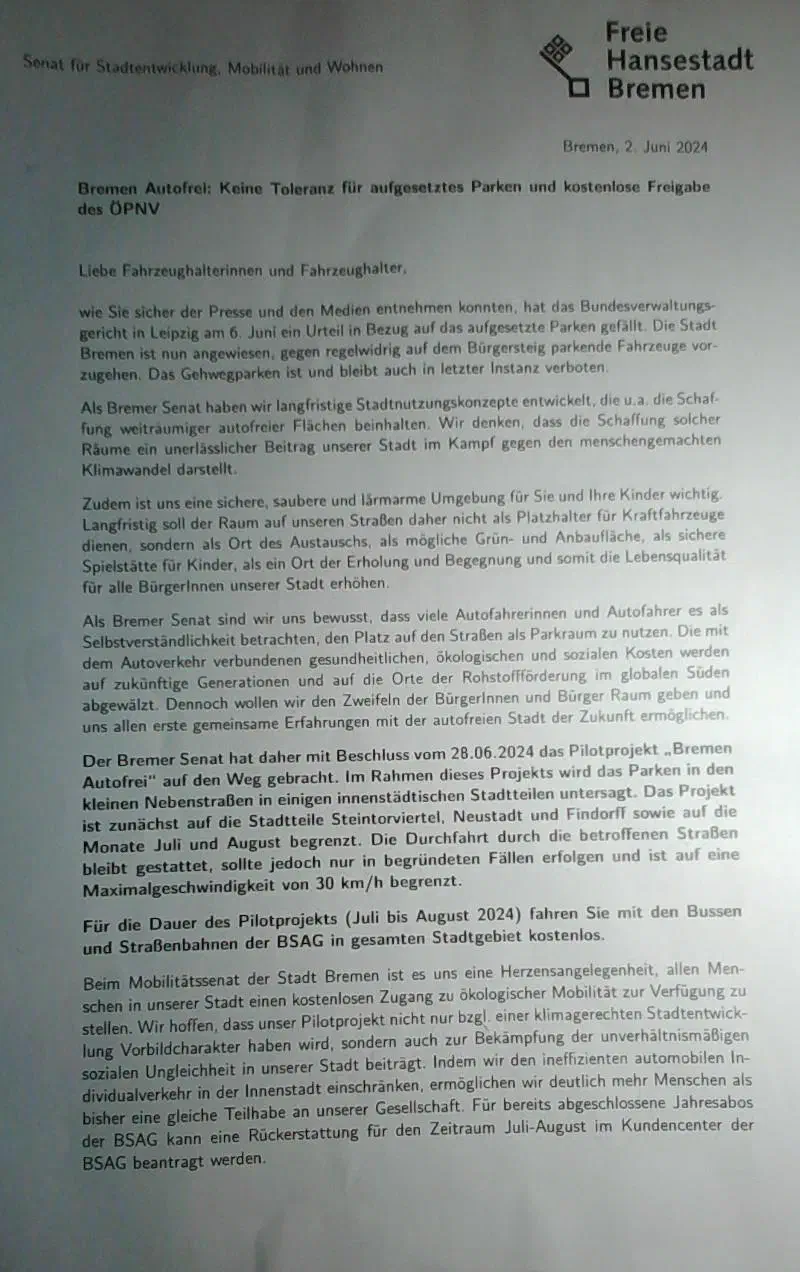 Am Abend des 2. Juli hat die Kommunikationsguerilla KAKA-PIBI “Keine Autos statt Kein Aufgesetztes Parken In der Bremer Innenstadt” ein gefälschtes Schreiben verteilt. Das Schreiben erweckt den Anschein von einer Bremer Behörde zu stammen, dem Senat für Stadtentwicklung, Mobilität und Wohnen, da es den offiziellen Briefkopf inkl. Bremer Schlüssel verwendet. In dem Schreiben, das im Bremer Stadtteil Neustadt an Hunderten aufgesetzt parkenden PKW hinter die Scheibenwischer geklemmt wurde, heißt es: “Der Bremer Senat hat daher mit Beschluss vom 28.06.2024 das Pilotprojekt “Bremen Autofrei” auf den Weg gebracht. Im Rahmen dieses Projekts wird das Parken in den kleinen Nebenstraßen in einigen innenstädtischen Stadtteilen untersagt.” Ab dem 8. Juli würden widerrechtlich abgestellte Fahrzeuge umgehend und kostenpflichtig abgeschleppt. Und weiter: “Für die Dauer des Pilotprojekts (Juli bis August 2024) fahren Sie mit den Bussen und Straßenbahnen der BSAG in gesamten Stadtgebiet kostenlos.”
