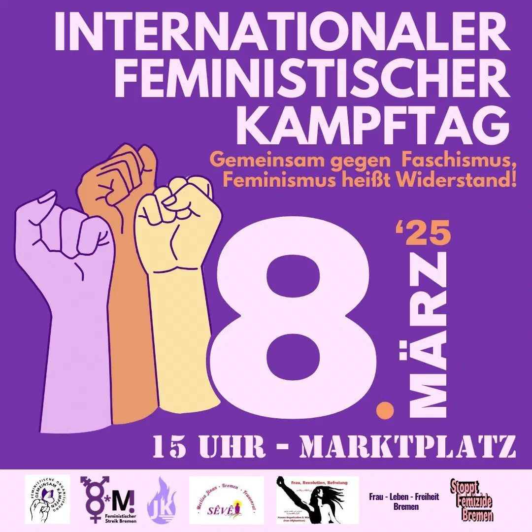 Die Demo ist gemeinsam organisiert von: Frauenrat Sêvê e.V., Frauen Organisation 8. März (Iran- Afghanistan), Frau – Leben – Freiheit Bremen, Gemeinsam Kämpfen – Feministische Organisierung für Selbstbestimmung und Demokratische Autonomie, Junge Frauen Kommune, Stoppt Femi(ni)zide Bremen und dem Feministischen Streik Bremen.
