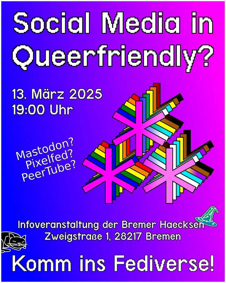 Die Bremer Haecksen veranstalten am 13.03.2025 ab 19 Uhr im Z1 einen Einstiegs-Workshop zum Fediverse für interessierte Queers* und FLINTA*-Personen, die sich von den großen Social Media Playern unabhängig machen wollen.