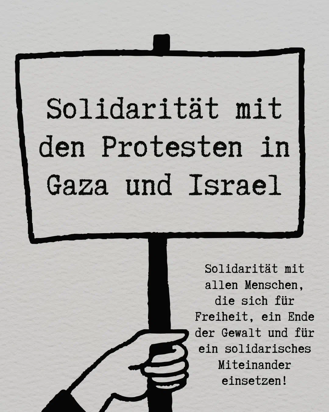Sich solidarisch mit den Menschen im Nahen Osten zu zeigen bedeutet auch, den Protestierenden in Israel zuzuhören, die sich für das Ende des Krieges und für Frieden einsetzen, sowie für eine freies Leben auf die Straße gehen. Die Protestierenden stellen sich auch ganz bewusst gegen die nationalistischen Kräfte im Land und kritisieren offen die Regierung Netanjahus.