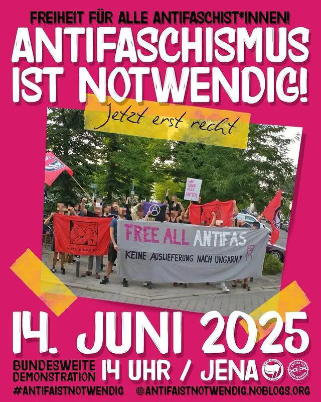 Wir sehen uns am 14.06.2025 um 14:00 Uhr in Jena, um unseren Frust und unsere Wut gegen ihre Repression zu zeigen und unsere Leidenschaft und Liebe für den Kampf für das bessere Morgen auf die Straße zu tragen. Wir verteidigen Antifaschismus in seiner Vielfältigkeit – gegen alle Spaltungsversuche!