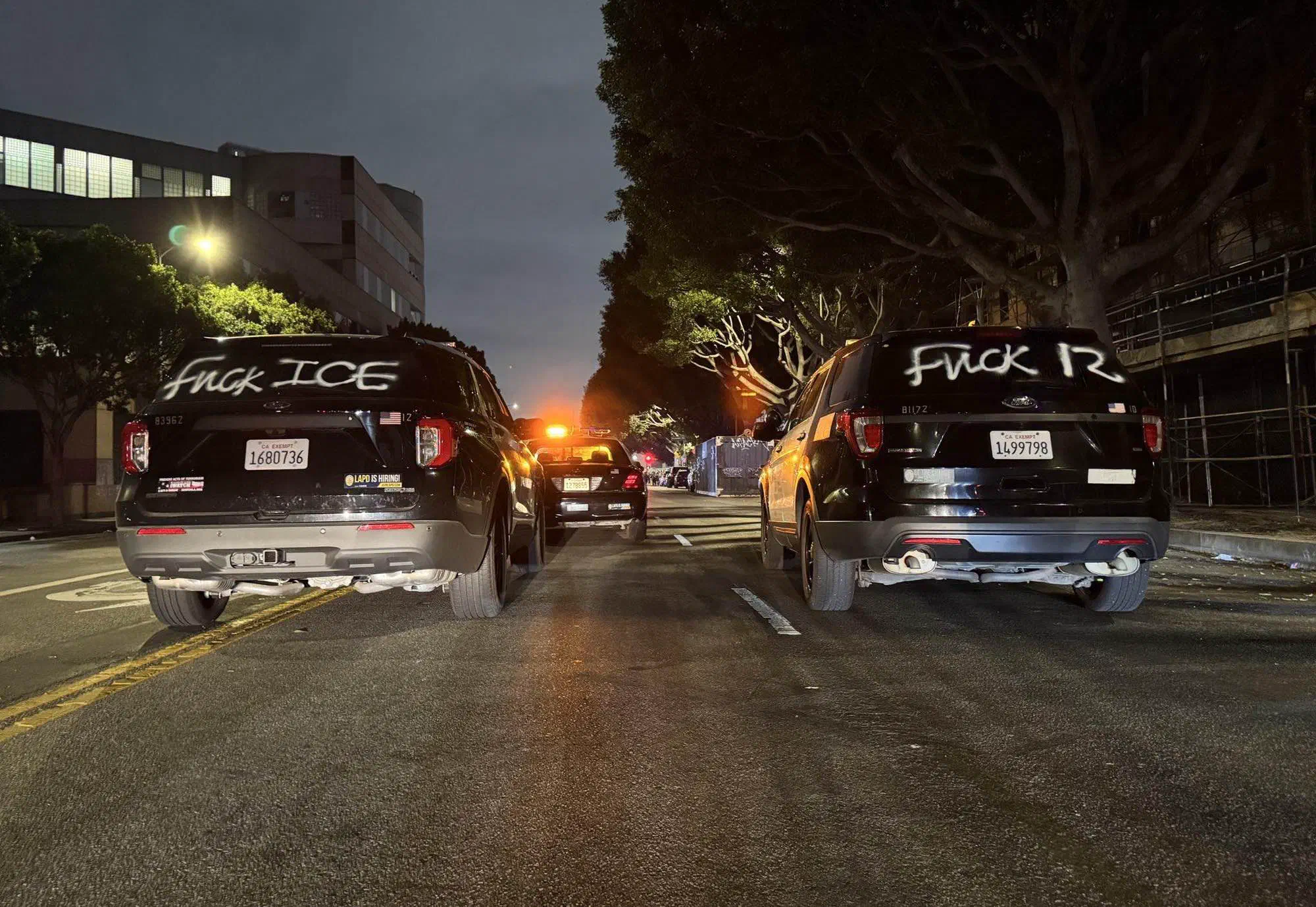Teilnehmer in der Menge markierten das gepanzerte ICE-Fahrzeug und begannen, darauf auf und ab zu springen, während ein LRAD ertönte. Jemand markierte „FUCK ICE“ und sprühte die Kameras auf ein selbstfahrendes Auto von Waymo. Mit Ausnahme eines starken Kontingents der Los Angeles Tenants Union, die im Laufe des Tages bei jeder Aktion anwesend war, waren keine Organisationen vertreten.