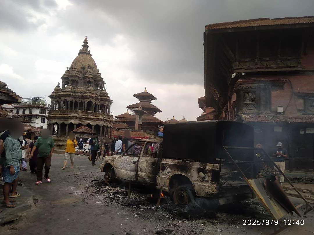 Ein ausgebranntes Bullenauto am Patan Durbar Platz am 9. September 2025