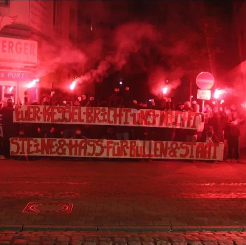 Die Demo fand unangemeldet statt. Wir fragen den Staat nicht um Erlaubnis, wenn wir gegen ihn protestieren. Nach der Demo kam es zu einem Polizeieinsatz, bei dem unsere Genoss*innen über Stunden gekesselt, in der Nacht in der GESA festgehalten und schließlich erkennungsdienstlich behandelt wurden.