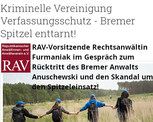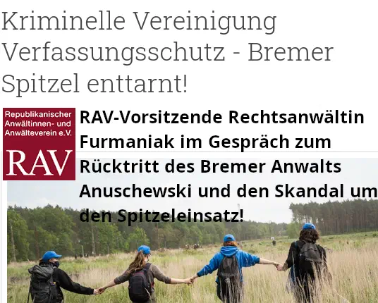 n Bremen aber auch darüber hinaus ist eine Debatte über Geheimdienstüberwachung und anwaltliche Unabhängigkeit entbrannt: Ein vom Verfassungsschutz eingesetzter V-Mann bespitzelte über Jahre linke Gruppen, darunter die Interventionistische Linke. Als dieser Spitzel enttarnt wurde, war auch der Bremer Rechtsanwalt Anatol Anuschewski als Anwalt vor Ort, um die Rechte Betroffener zu wahren. Anuschewski war zugleich stellvertretendes Mitglied am Bremer Staatsgerichtshof.