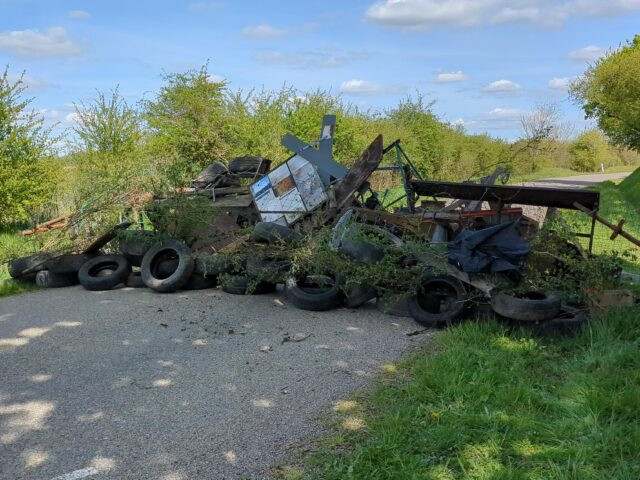 Für das Wochenende vom 16 bis zum 20. April gab es einen Aufruf am Bahnhof zusammenkommen und sich gemeinsam kraftvoll am 20. zu verabschieden. Am Sonntag war es dann soweit. Kurz vor 15 Uhr wurde die Straße zwischen Lumeville und Mandres besetzt und verbarrikadiert. Nach einer Stunde fröhlichem Barrikadenbauens setzten sich viele der Anwesenden zu einer Demonstration nach Mandres in Bewegung und verabschiedeten sich von diesem geliebten Ort.