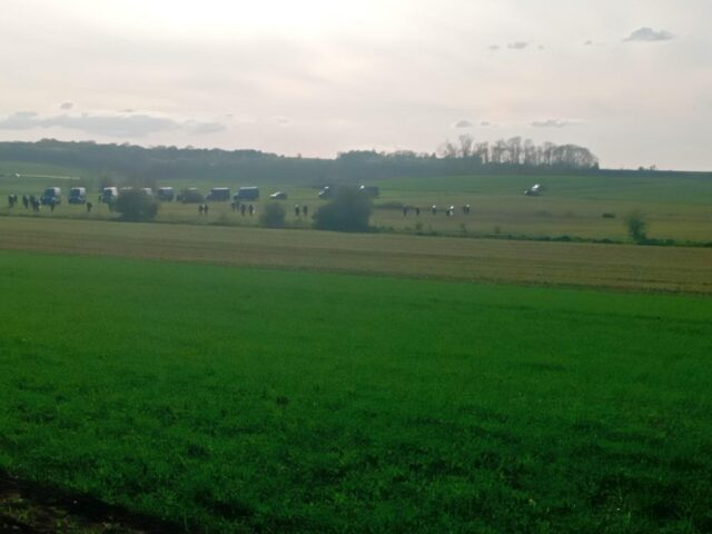 13:50 Uhr: 3 Polizisten neben dem Misthaufen auf dem Feld Auf dem Weg, der von der D138 zum Bois de Glande Noix führt (in Richtung Labor)